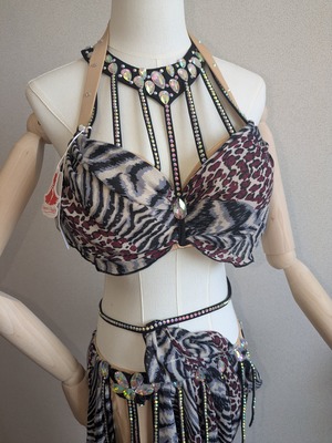 注目のゼブラ柄デザインが目を引くオリエンタル衣装は、ベリーダンスを存分に楽しむための必須アイテムです!動くたびに魅力的なシルエットを演出し、注目を集めること間違いなしです。